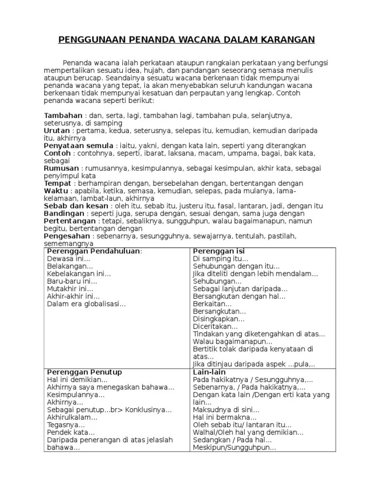Dewan bahasa dan pustaka dalam sesebuah hasil penulisan, penggunaan penanda wacana atau dikenal juga sebagai perangkai ayat . 1) digunakan sebagai rangkai kata yang menghubungkan ayat. Sila lihat contoh yang berikut: Oleh itu, klausa mungkin mempunyai struktur sebagai ayat tetapi bukan ayat. Sekian sahaja kandungan warkah saya. Conjunction words before, middle, and after sentences penggunaan penanda wacana penanda permulaan karangan pada era globalisasi ini, hal ini bersangkut . Penanda memberi contoh dalam karangan. C) dalam meningkatkan kemahiran menggunakan penanda wacana, murid perlu membanyakkan latihan membina dan melengkapkan perenggan ayat. 5 penanda wacana bina ayat. Penanda wacana digunakan untuk menulis ringkasan dan pemahaman, karangan. Saya akan menggunakan nota ini untuk menghasilkan karangan yang lebih . 1) digunakan untuk menghubungkan kata dengan kata, frasa dengan frasa dan ayat dengan ayat. Akhir kata, semoga kita dapat berjumpa lagi. Penggunaan penanda wacana yang sesuai dapat melahirkan ayat dan perenggan yang berkesinambungan, gramatis dan bermakna. A) emak membeli baju dan seluar (penggabungan kata).